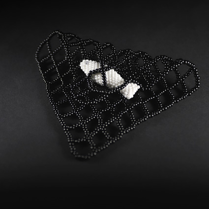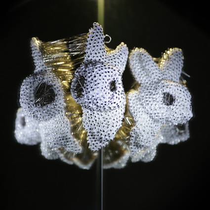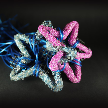 jewellery sculpture (concrete, glass beads, hematite, metal pins, rose quartz, steel, a plastic toy)