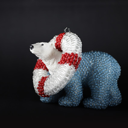 brooch (glass beads, metal pins, a plastic toy, a plywood object, steel)